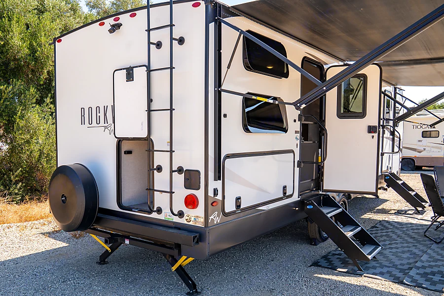 "Lucy" features not one but TWO outdoor kitchens one with a mini fridge and 2-burner stove, and one with a flatiron grill! There is also a TON of storage inside and out, room to transport bikes inside or out, 2 awnings for the ultimate in outdoor living and 2 entrances!